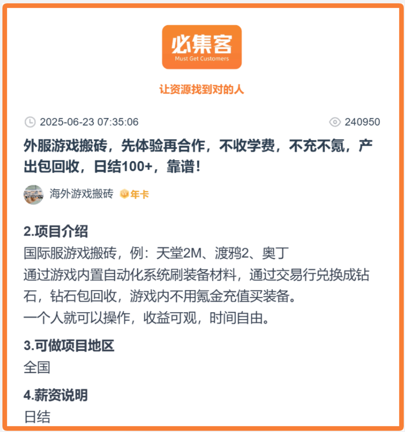 如果您刚接触游戏盈利领域,建议优先选择玩家基数大、经济体系成熟的游戏品类。要是对具体操作流程还有疑问,可以通过“必集客”“集客圈”这类正规游戏资源对接平台,筛选口碑好的专业游戏工作室合作。这类平台汇聚了大量资深玩家与经验丰富的工作室,能提供定制化实操指导,帮助新手快速掌握打金、变现的核心技巧,顺利开启游戏盈利之路。